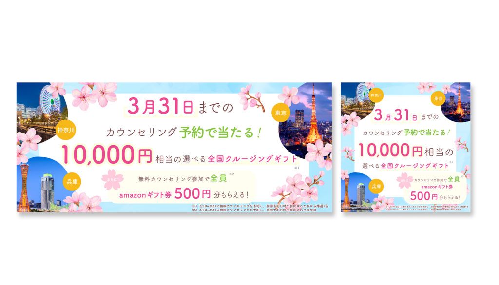 バナー作成 2025年10月8日 最終更新日時 : 2025年10月8日 airi 【製作時間】3時間/1枚【使用ソフト】Photoshop・illustrator【担当業務】デザイン【意識した亊】春らしい季節感が伝わるデザインにしました。